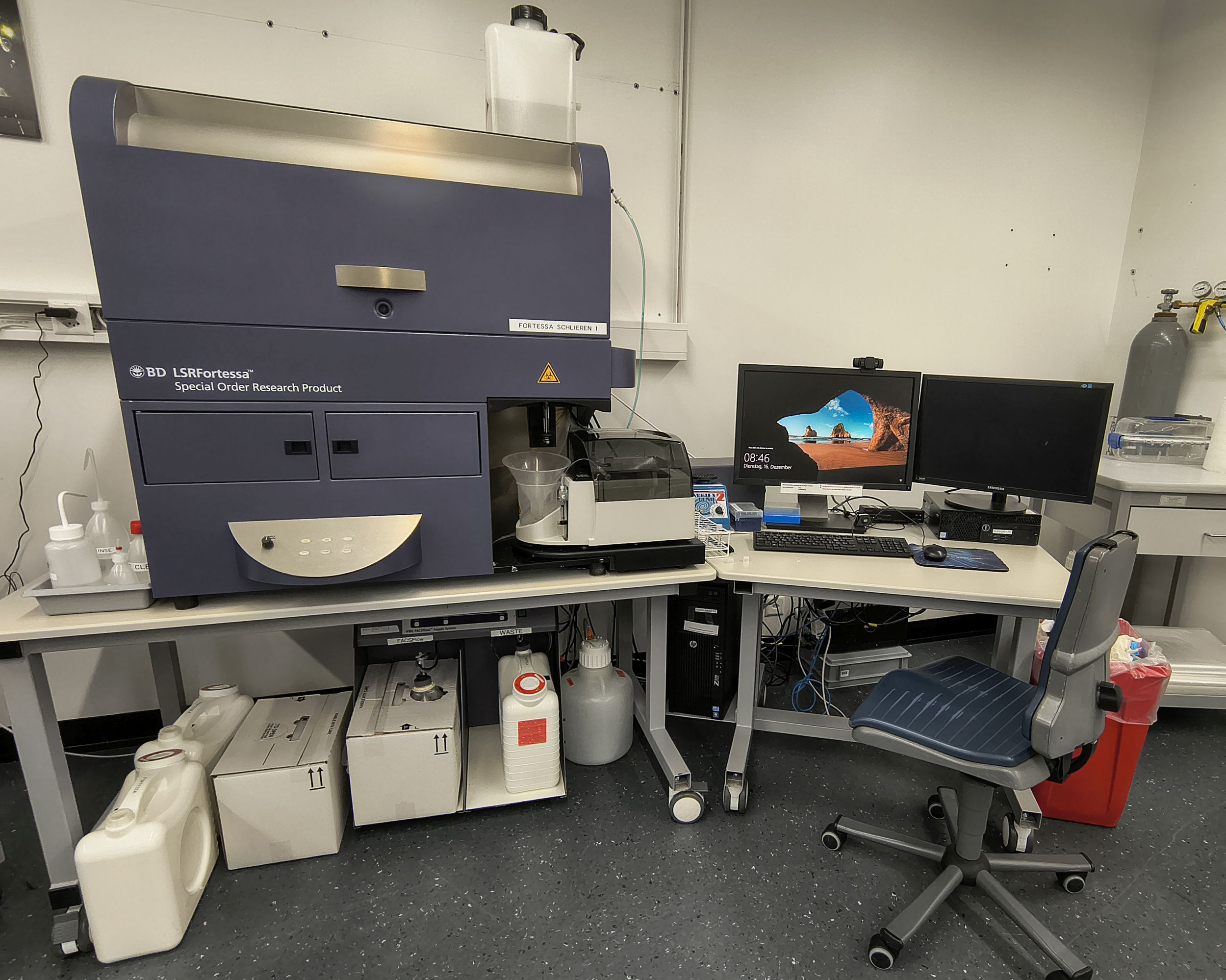 High-end BD SORP flow cytometer with 4 lasers and 18 measureable parameters (usually 2 light-scatter signals and 16 fluorescent signals).